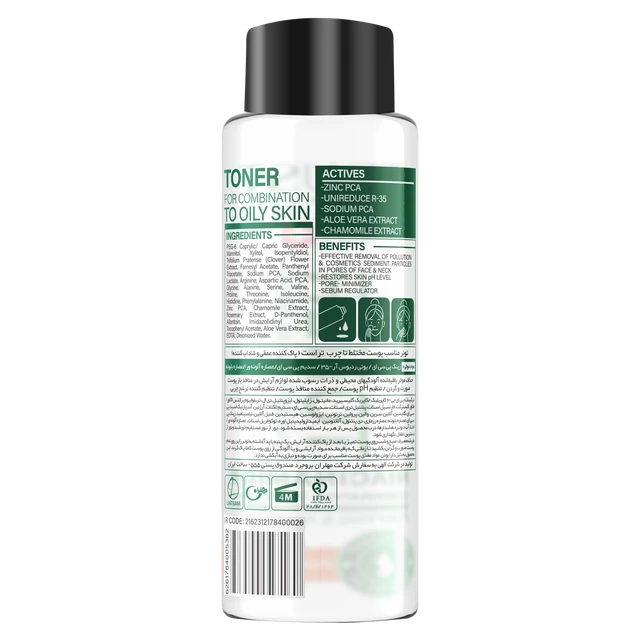 ویژگیها: - پاککننده عمقی و موثر باقیمانده آلودگیهای محیطی - حذف ذرات رسوبشده لوازم آرایش در منافذ پوست - تنظیم ترشح غدد چربی، ضدالتهاب و شادابکننده - جمعکننده منافذ باز پوست - فاقد مواد قلیایی و تنظیمکننده pH پوست - مناسب پوستهای مختلط تا چرب - بدون نیاز به شستشو صورت